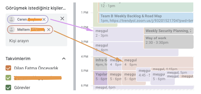 Uygun toplantı aralığı bulmak: Son olarak, bu ipuçları arasında en bilinen olabilir ancak değinmeden geçmeyelim; Google Calendar üzerinden takvim daveti yollayacağınız kişilerin isimlerini görselde görünen alana yazarak takvimlerinde uygun olan alanları kendi takviminiz ile birlikte görebilir ve boşlukları daha rahat bulabilirsiniz.
